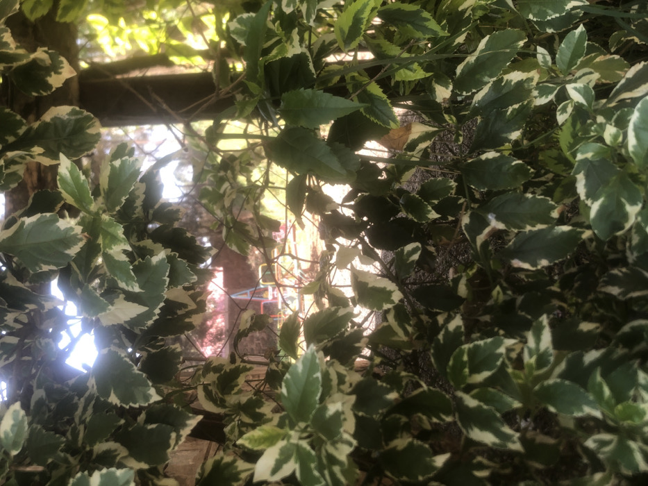 The image presents an outdoor scene located in Ngong ward, Kenya, viewed through dense, variegated foliage. The immediate foreground is filled with numerous leaves, predominantly green with distinctive white or cream margins and patches. Through openings in this foliage, a children's playground is partially visible in the midground. The playground features colorful structures, including elements appearing red, yellow, and possibly blue, against a light-colored ground surface, likely sand or dry earth, illuminated by sunlight. A dark, vertical support post, possibly wooden, is partially visible among the leaves on the right side of the frame. In the left background, a reddish-brown wall or building is faintly discernible. No people are present. The lighting indicates a sunny daytime environment.
