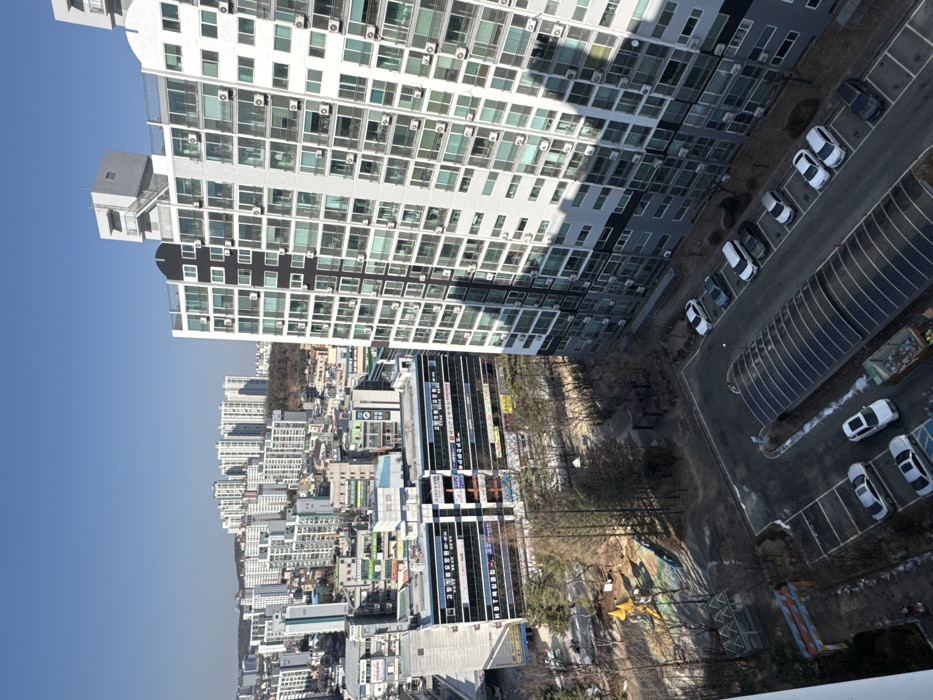 An aerial view of a dense cityscape features modern apartment buildings, a parking lot with cars, and a playground with colorful equipment. The buildings are tall and white, contrasting with the clear blue sky. The parking lot showcases parked cars and a solar panel-covered awning. Trees line the streets, adding a touch of nature to the urban environment.