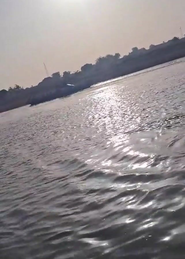 body of water, possibly a river, with sunlight reflecting off the surface. The water is rippling. In the distance, there is a shoreline with some vegetation and buildings, possibly including a crane or other industrial structure. The sky is bright and slightly hazy. No people are visible in the video. The camera appears to be moving slightly, likely from being held in a boat or near the water's edge.