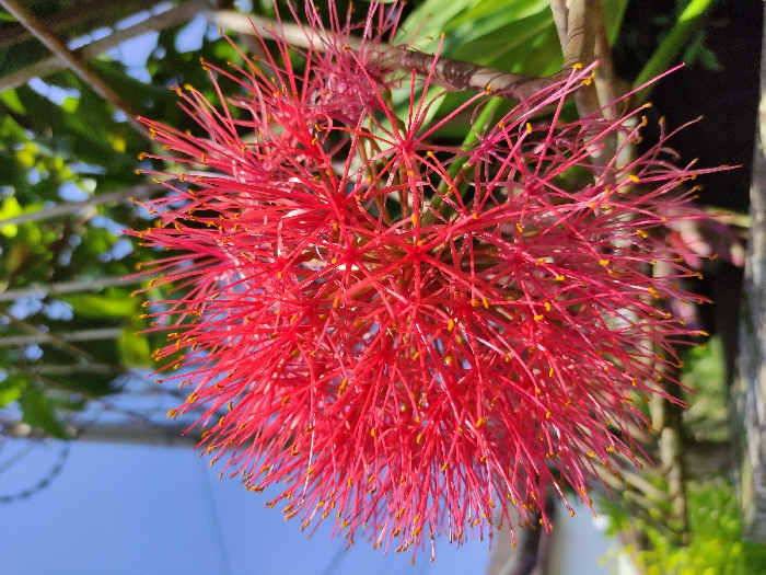 A close-up photograph captures a spherical, bright red flower, presumed to be located in Nieste, Germany. The flower is comprised of numerous thin, spiky red filaments, each terminating in a small, golden-yellow anther. It occupies the central and left portions of the frame, presented in sharp focus. The upper-left background reveals a clear blue sky, while blurred green foliage and dark brown branches are visible in the upper-right. The lower-left background shows indistinct light-colored structural elements, possibly a building or wall, above a grey, textured surface. The scene is illuminated by strong natural daylight. No people, specific actions, or interactions are present.