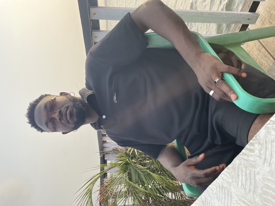 A man with dark hair and a beard sits in a green plastic chair. He wears a black polo shirt, black shorts, and sunglasses. Silver rings adorn his fingers, and earrings are visible. Behind him, a body of water and a light-colored sky can be seen. A palm tree is visible. The man is angled in the chair, facing toward the left.