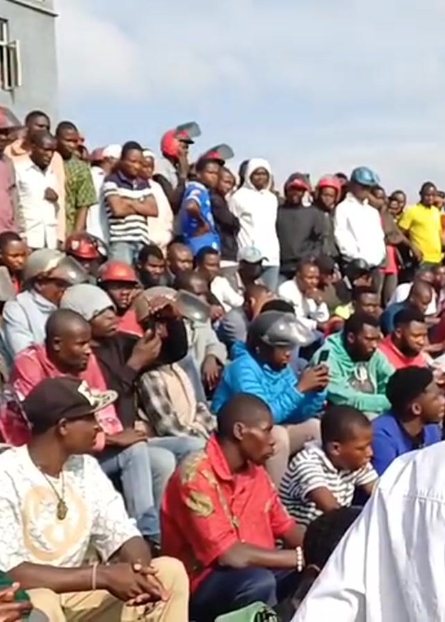large group of people sitting on bleachers. Most are wearing helmets, many of which are red. The crowd appears to be predominantly men. A few are standing near the crowd. The setting appears to be outdoors, near a building with a light-colored facade and visible windows. The sky is light blue with some clouds.