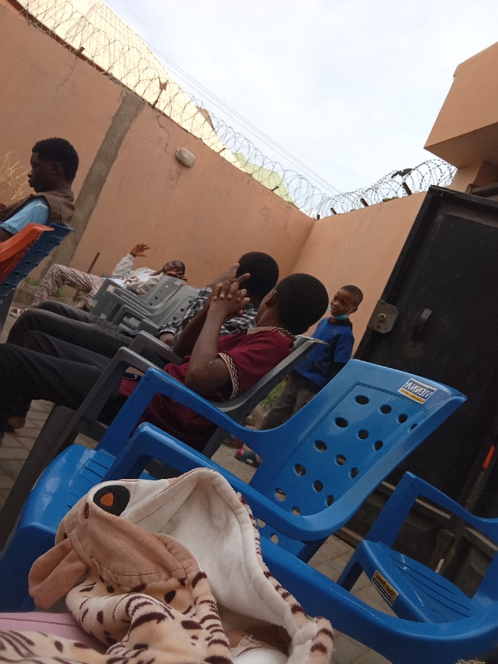 Several people sit in plastic chairs outdoors, possibly waiting. A young boy in a blue sweatshirt stands near a black door. Behind them, a tall, peach-colored wall is topped with barbed wire. The foreground features a tan and white tiger-striped jacket draped over another blue plastic chair, blurring the focus. The scene suggests a casual gathering or waiting area in a backyard or courtyard setting.