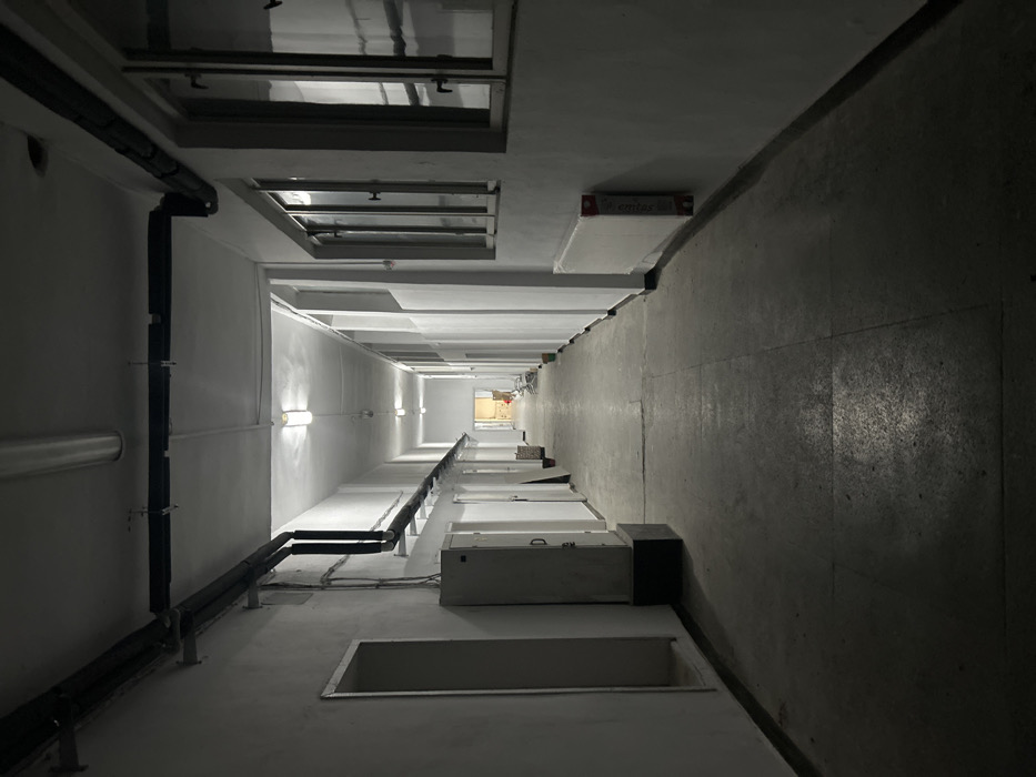 The image depicts a long, empty, and dimly lit interior hallway within a building stated to be in Pleven, Bulgaria. The perspective is centered down the length of the corridor, which recedes towards a brighter area at the far end. The walls are painted a light, off-white or cream color, and the ceiling is also light-colored. The floor consists of dark gray concrete or worn tiles, showing subtle reflections from overhead light sources. Along the left wall, multiple closed, white doors are visible, extending into the distance. In the immediate foreground on the left, an open doorway or architectural recess is present. Further down the left wall, a tall, narrow, light-colored metal cabinet or locker stands on a dark base. Dark, insulated pipes run horizontally along the upper portion of the left wall, extending down and along the ceiling. The right wall features a series of multi-pane windows with dark frames, reflecting internal light and elements. Beneath a window on the right side in the mid-ground, a white, rectangular radiator, appearing to be new and possibly wrapped in protective material, is mounted on the wall. Overhead, multiple fluorescent tube light fixtures are mounted flush with or suspended from the ceiling, providing uneven illumination that brightens considerably towards the distant end of the hallway. Towards the far end, indistinct objects, including what appears to be a white trolley or cart and some stacked items, are visible near doorways. No individuals are present in the scene, and no discernible actions or interactions are occurring. The environment presents as utilitarian, suggestive of an institutional or administrative building, with an appearance of age and possibly recent or ongoing maintenance.