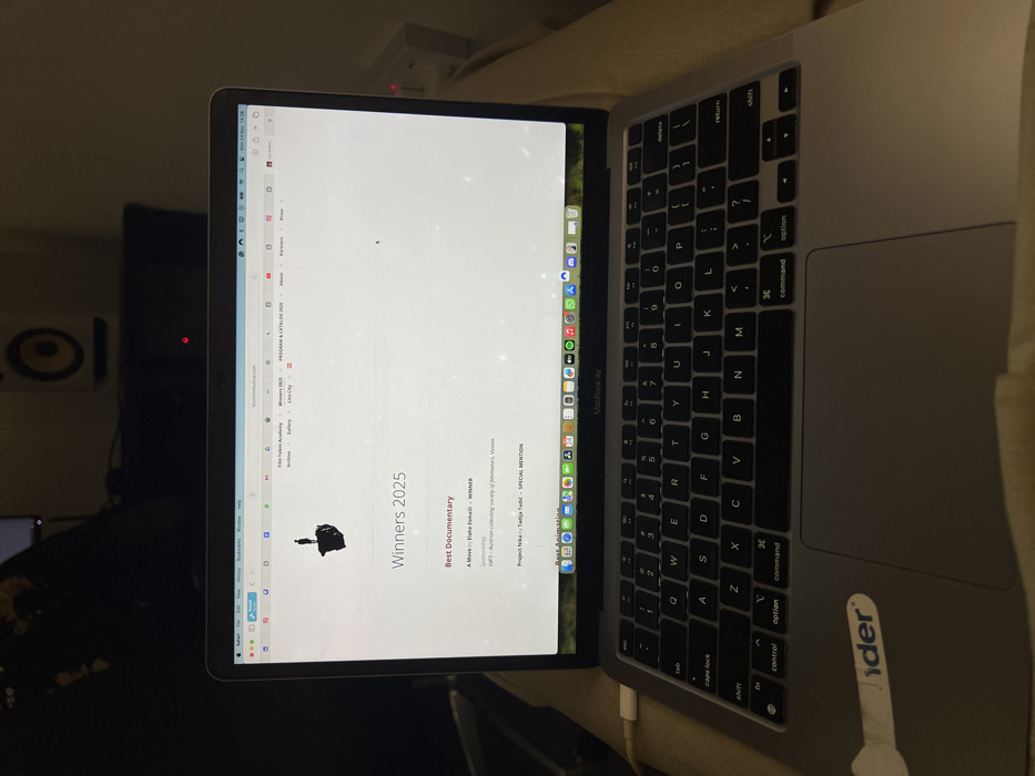 This image, taken in Narayi, Nigeria, depicts a silver Apple MacBook Air laptop situated in a dimly lit indoor environment. The laptop's screen is illuminated, displaying a webpage from "lindafilmfestival.com." The page content is titled "Winners 2025," featuring "Best Documentary" winner "A Move by Elahe Esmaeili" and "Project Nika by Tadija Tadic" with a "SPECIAL MENTION." The macOS dock and menu bar are visible on the screen, indicating the current date and time as "Mon 24 Nov 14:28." A white charging cable is connected to the left side of the laptop. A partially visible white "Tinder" sticker is affixed to the palm rest area below the keyboard on the left. In the out-of-focus background, a professional audio monitor speaker with a distinct yellow circular element is visible on the right, above a dark surface with a faint red indicator light. To the right of the laptop screen, a white wall-mounted power outlet with two red indicator lights is also partially visible. The laptop rests on a light-colored, possibly fabric surface. No individuals are present in the scene.