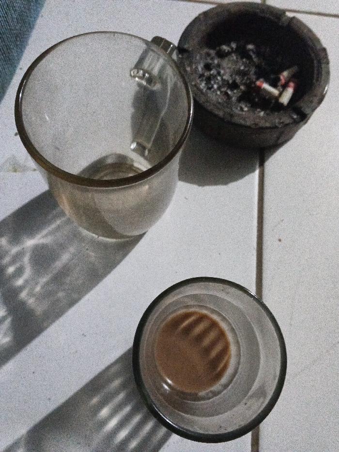 The image displays an overhead view of three objects resting on a light-colored, tiled surface with dark grout lines. In the upper left, a large, empty, transparent glass mug with a handle is present, exhibiting some residue at its bottom and casting a distinct shadow to its lower left. To the upper right of the mug, a dark, circular ashtray, possibly made of wood or ceramic, is filled with ash and contains at least two visible cigarette butts, one with a red filter tip. In the lower right, a smaller, transparent glass, cylindrical in shape, holds a shallow quantity of light brown liquid. Strong directional lighting from an unseen source casts elongated shadows from the objects onto the tiled surface. No individuals are depicted. The location is an indoor or covered outdoor area in Unknown, Unknown.