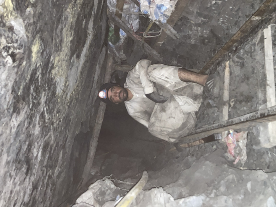 A miner wearing a headlamp is positioned inside a narrow mine shaft