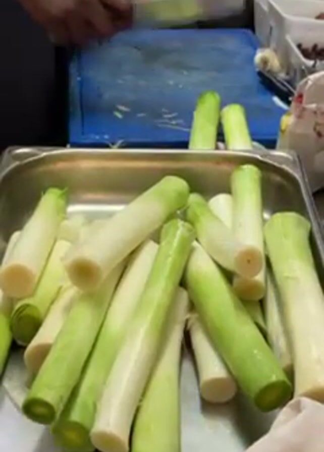 A person wearing a dark shirt is cutting leeks on a blue cutting board with a light-colored knife in a professional kitchen environment. A metal tray filled with leeks is in the foreground. The person is slicing the leeks thinly on the cutting board. The environment suggests food preparation, with containers and tools visible in the background.