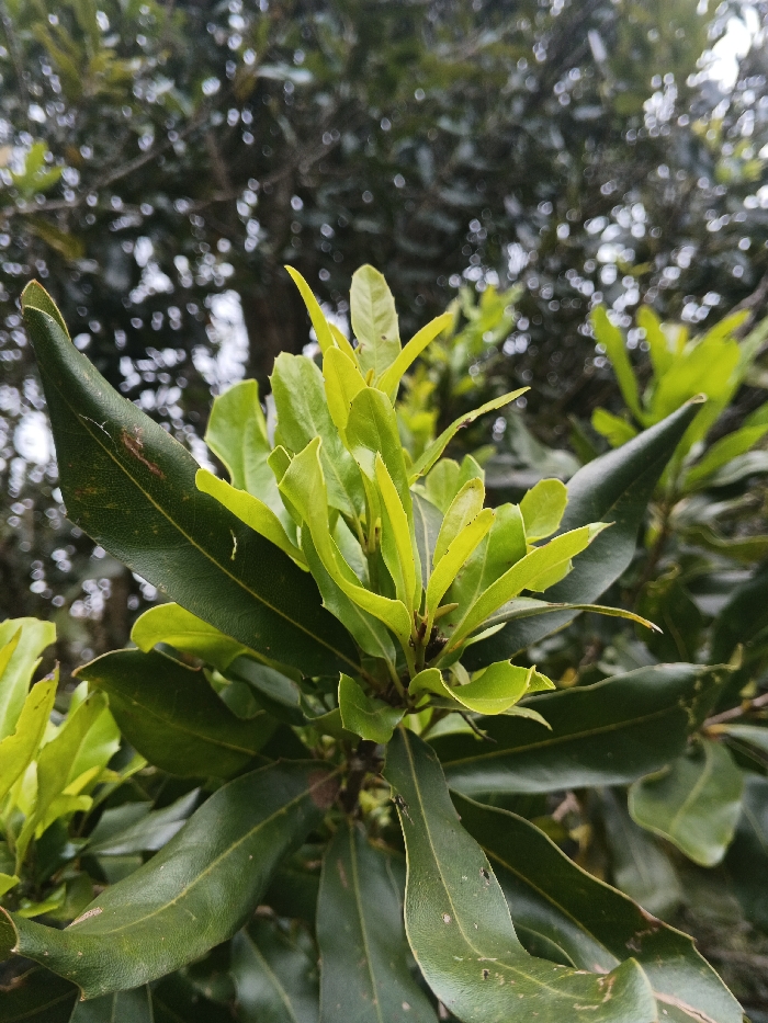 A close-up shows bright green leaves clustered near the top of a tree branch. The leaves have a smooth, glossy appearance, and some appear lighter in color, indicating new growth. The background is blurred, suggesting a dense canopy of trees with bokeh effect. The dark green leaves in the foreground frame the brighter leaves, creating a contrast in colors and textures.
