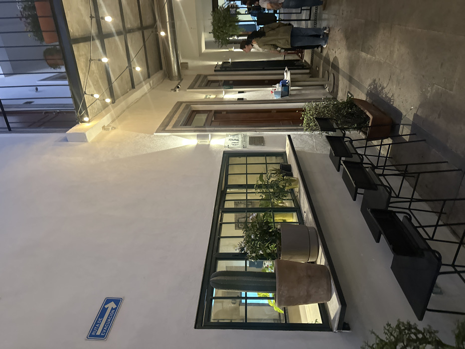 A tilted shot shows a building with a covered walkway overhead. On the white wall, a blue "Ruta de Evacuación" sign is visible. A large window with potted plants, including a tall cactus, sits above the sign. To the right are small metal tables with chairs, and a long rectangular planter. People are visible walking in the covered walkway, which is lit by string lights. The walkway floor is a stone pattern.
