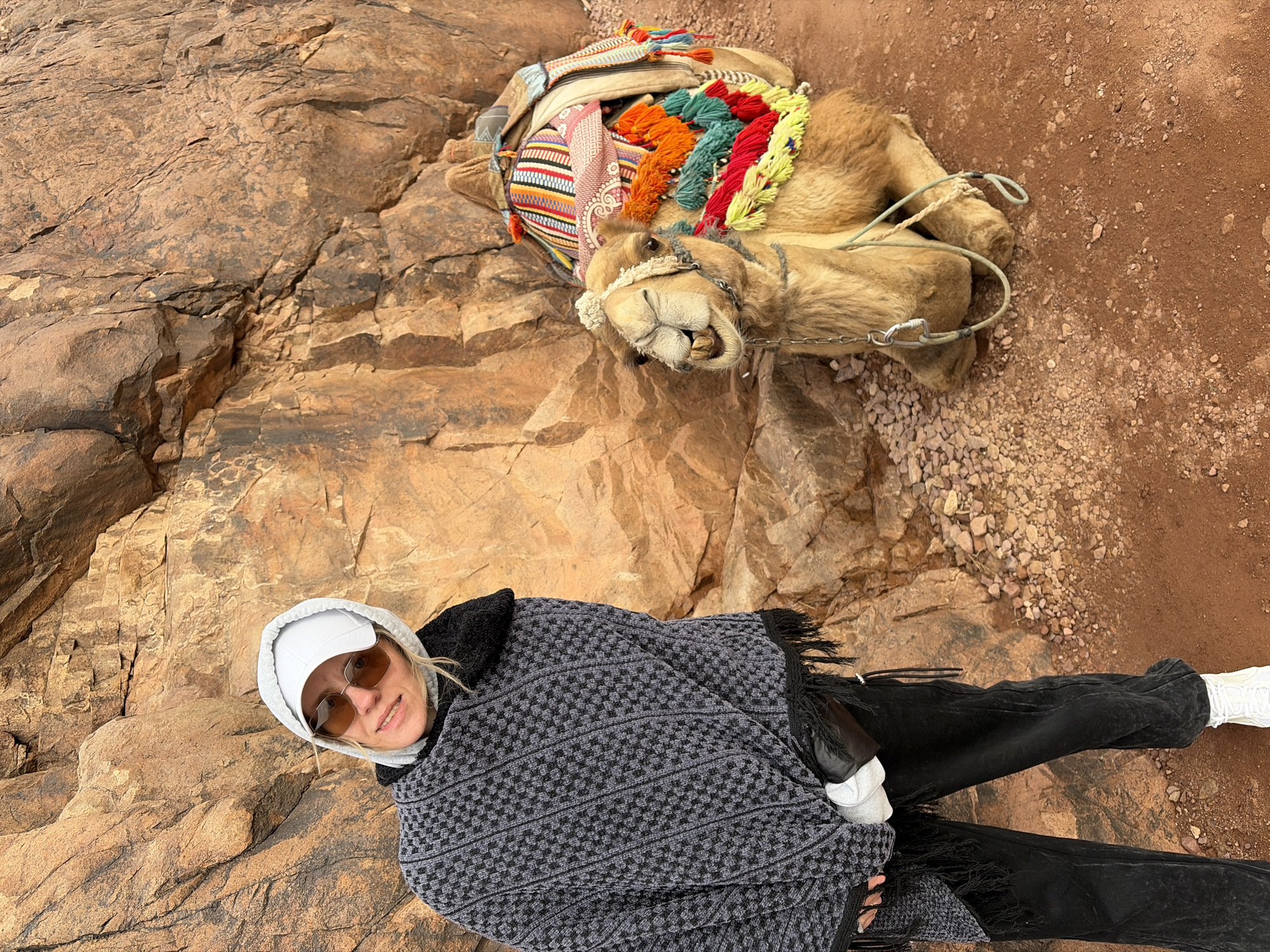 A woman in sunglasses and a hooded sweatshirt, wearing a gray poncho, sits on a rocky slope next to a camel that is lying down. The camel is equipped with a colorful saddle blanket and rope restraints. The ground consists of varied terrain including rocky areas and reddish-brown soil. This image appears to be in an outdoor environment, potentially in the city of Saint Catherine, Egypt.