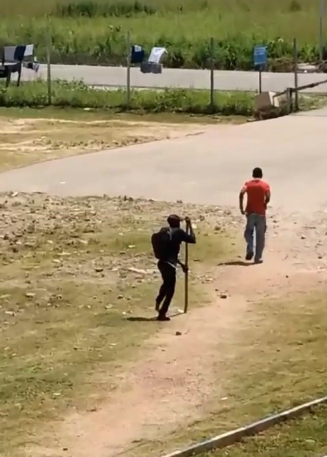 two men in a grassy area bordered by a road, with a backdrop of a green field and utility poles. One man, wearing an orange shirt and jeans, is walking away from the camera on the road. The other man, dressed in black with a backpack, is carrying a long, slender object resembling a bat or stick. He is jogging on the grass, mimicking a batting stance and swing. The environment includes elements such as a brick walkway, a small fence, and various signs and objects visible in the background along the road.