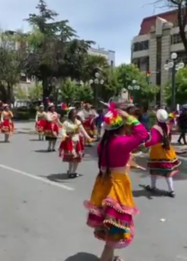 group of women performing a traditional dance in a public space. The women are wearing brightly colored outfits, including full skirts with multiple layers of ruffles, and hats decorated with feathers or flowers. They are moving in a circular pattern, following the rhythm of music that is audible in the background. The dance takes place on a paved area, possibly a street or plaza, with buildings and trees visible in the background. The weather appears to be sunny and clear. The dancers seem to be enjoying themselves and their movements are coordinated. Some people can be seen watching the performance in the background.