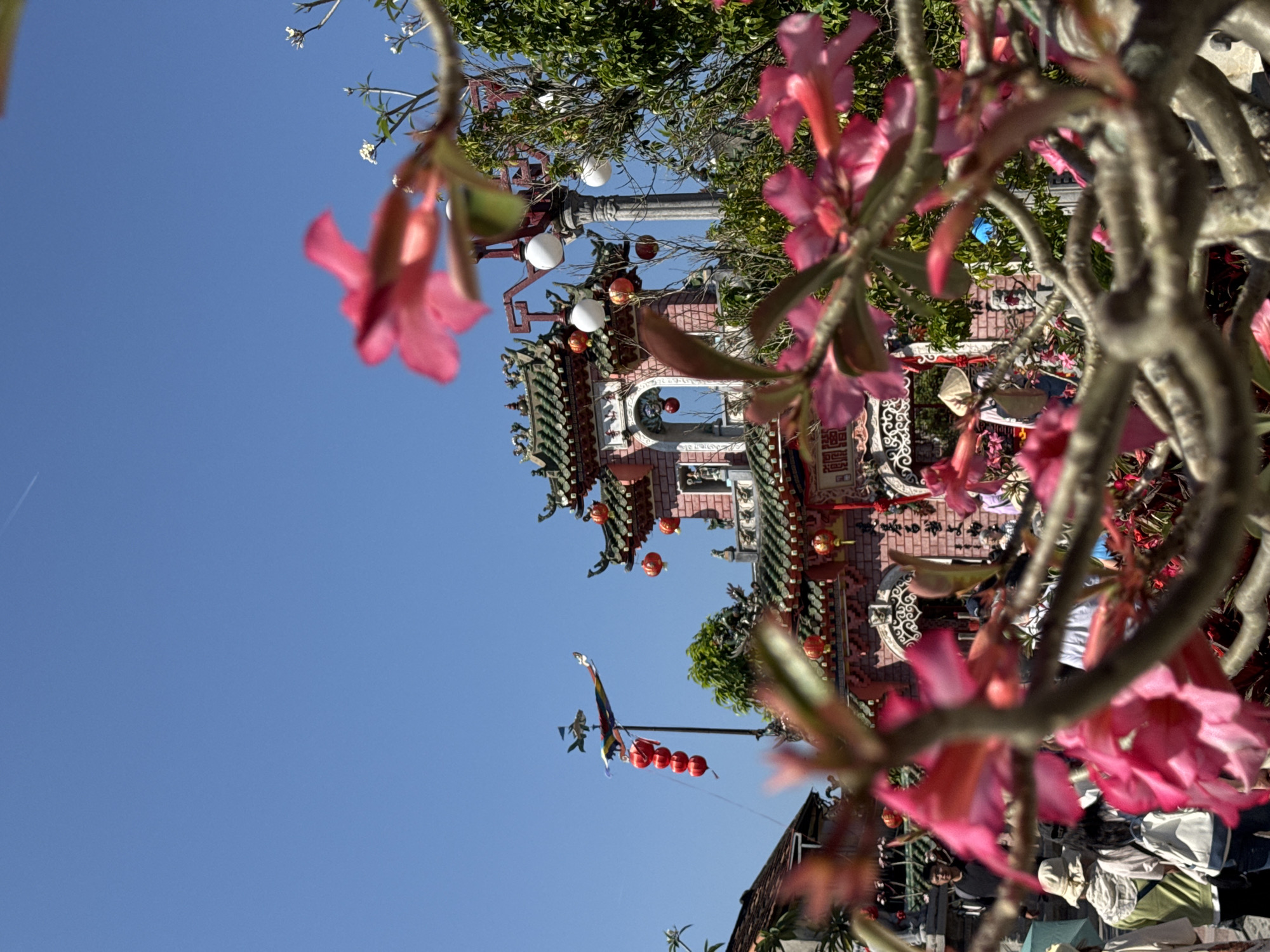 The image depicts a temple in Hội An Ward, Vietnam, viewed from a low angle, framed by a tree with pink flowers