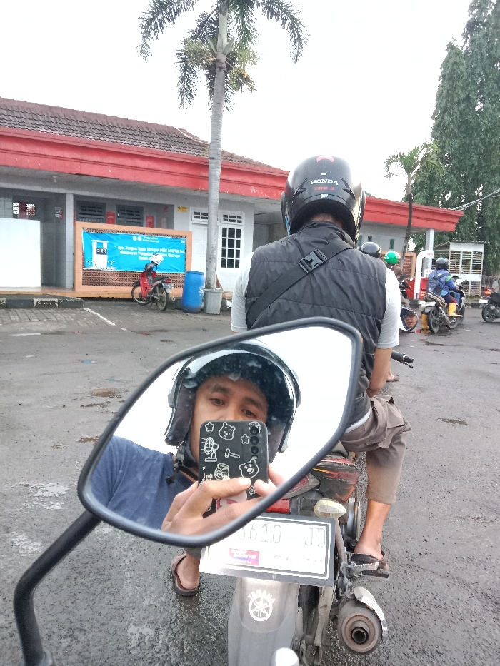 A man in a motorcycle helmet takes a selfie in the motorcycle's side mirror. The reflection shows his face and phone. The main view reveals the back of another man, also in a helmet and vest, on the same motorcycle. They're stationary in a group of motorcycles. In the background, a low building with a red roof and a palm tree are visible. The scene appears to be outdoors on a cloudy day.