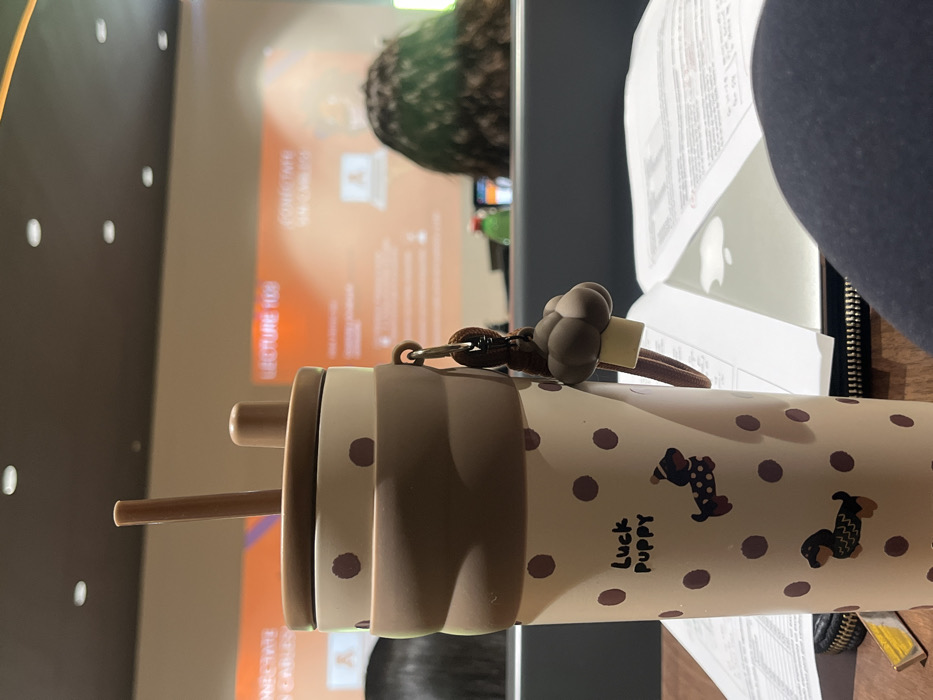 The scene depicts an indoor lecture or classroom setting located in Fraccionamiento Los Heroes Queretaro, Mexico. In the immediate foreground, a beige water bottle with brown polka dots and a brown silicone grip band occupies the central frame. The bottle features the text "Luck Puppy" and illustrations of two dachshunds. It has a brown lid with a visible straw and a small stopper. A brown mushroom-shaped charm hangs from a strap attached to the bottle. The bottle rests on a dark wooden surface. To the left, a portion of a black zippered pouch and a small yellow object are visible. To the right, an open book or notebook displaying text is present, with the faint reflection of an Apple logo visible beneath it, likely from a laptop or tablet. A segment of dark blue fabric, presumably clothing, is visible in the bottom right corner. In the midground, blurred, the backs of two individuals are visible. The individual on the left has dark hair, while the individual on the right displays curly, green-tinted hair. Both appear to be seated in front of desks or partitions. The background features a large, blurred projection screen displaying an orange background with white text. Partially legible text includes "LECTURE 103" and "CONECTATE UN CABLE," accompanied by a graphic of a laptop. Recessed ceiling lights are visible above the screen. The overall lighting is artificial.