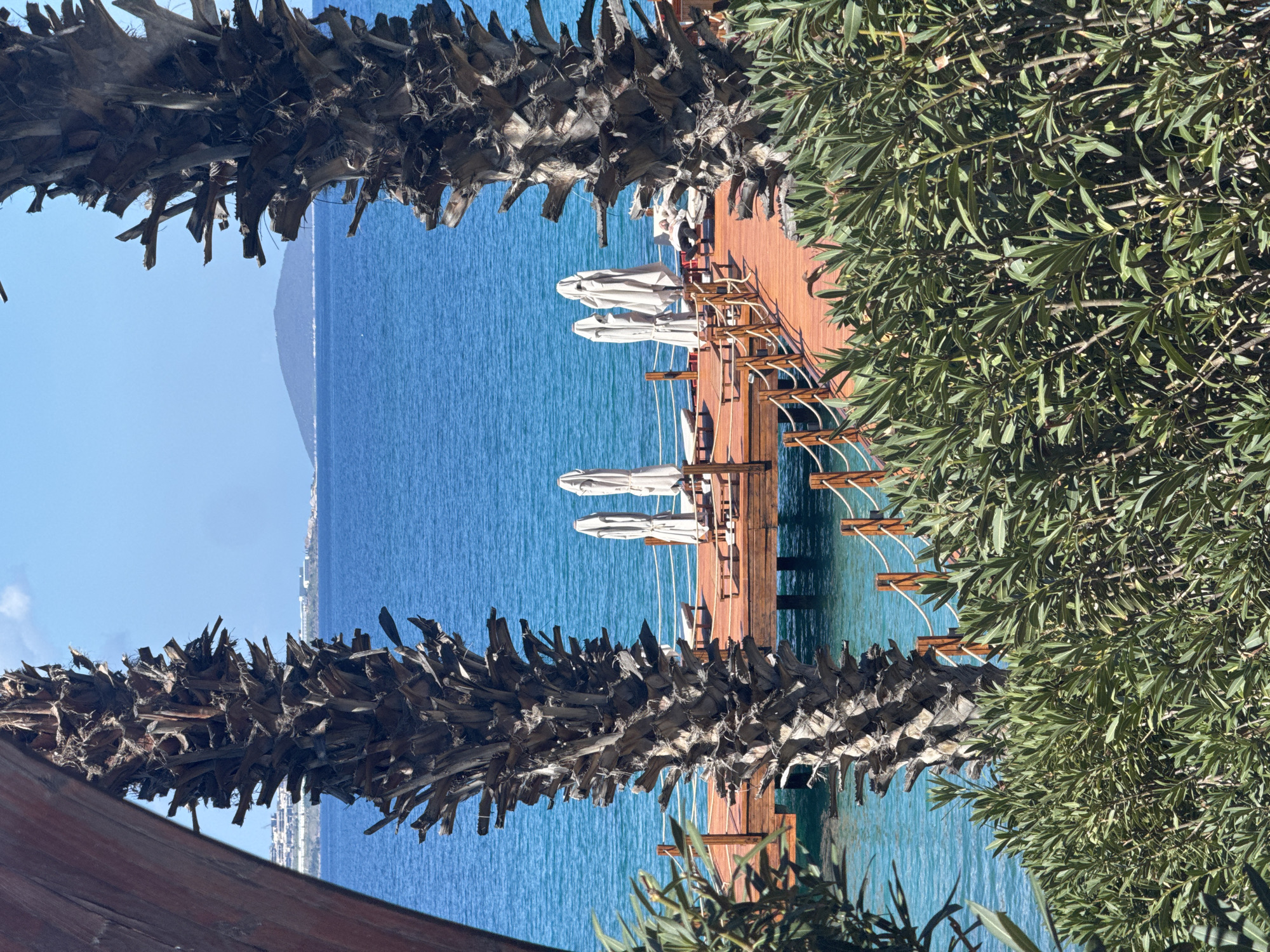 This image shows a view of the Aegean Sea and a wooden pier from a perspective framed by a palm tree trunk on the left and leafy trees on the right