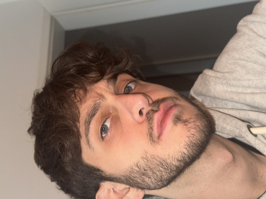 A close-up, angled selfie captures the upper torso and head of a young adult male in an indoor setting. The subject has medium-dark brown, wavy hair and blue eyes, with a light complexion and short, dark beard or stubble covering his jawline and chin. His mouth is slightly downturned, and he maintains a direct, serious gaze towards the camera. He is wearing a light gray hooded sweatshirt, identifiable by the fabric texture and a visible drawstring loop on the lower right. The background is indistinct, consisting of a plain, light-colored wall or surface to the left and top, and a darker, blurry vertical element, possibly a doorframe or corner, to the right. The lighting appears direct and artificial. The scene is situated in Strasbourg, France, as provided, though no specific visual markers of the city are present within the image.