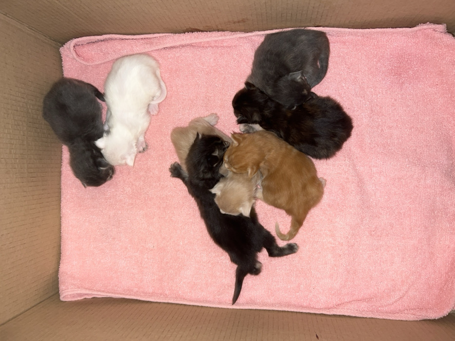 - "Within a brown corrugated cardboard box, located in the city of Korobovo, Russia, a pink terry cloth towel serves as bedding for seven newborn kittens" by FM-Ke9ym1, licensed under CC BY 4.0