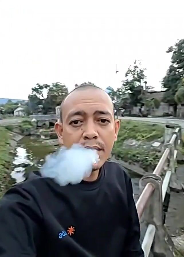 A medium shot shows a bald man standing on a bridge, facing the camera, smoking a cigarette. He is wearing a black long-sleeved shirt with a small colorful design. The bridge has concrete railings. Behind the man is a small stream or canal. The background shows a residential area with houses and trees. The sky is overcast. The man exhales smoke toward the camera.