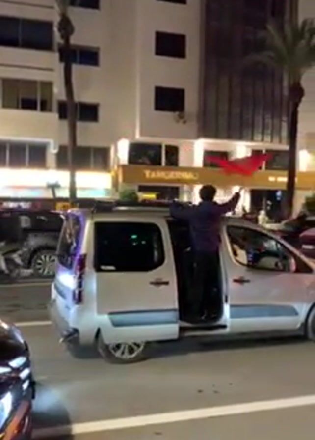 The video depicts a night scene on a city street filled with slow-moving car traffic. A silver van with its passenger side door open is the focal point, with a person standing inside, waving a red Moroccan flag. In the background, buildings with illuminated signs, including "TANGERINO" and "Barceló Tanger", are visible. Palm trees line the street, and other people are seen standing amidst the cars. The street is well-lit by streetlights and building lights. The overall atmosphere suggests a celebration or gathering in the city.