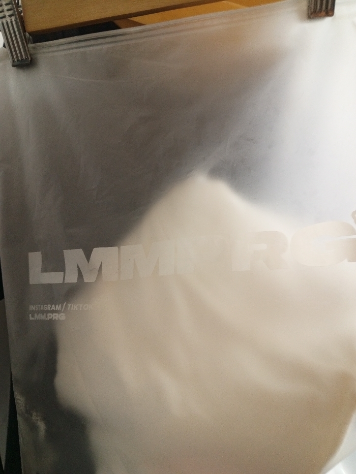 A garment bag, likely made of a translucent plastic, hangs on a wooden clothes rack using metal clips. The text "LMM PRG" is printed in a bold, sans-serif font on the bag's front. Below it, smaller text reads "INSTAGRAM / TIKTOK LMM.PRG". The bag's contents, possibly clothing, are visible as a blurred shape within. The bag is slightly wrinkled and has a grainy texture due to the plastic material.
