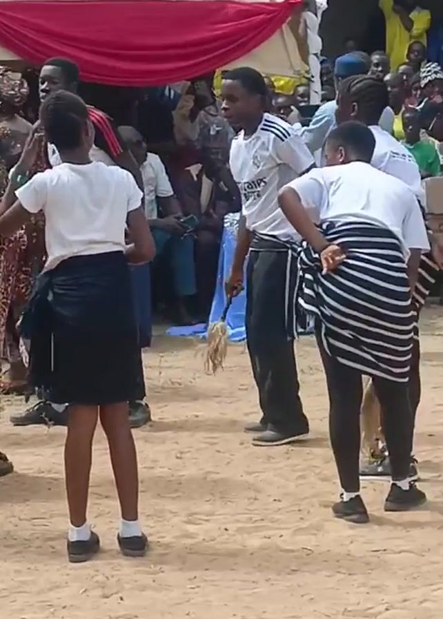 A group of young people dance in a dirt field in front of a crowd of people gathered beneath a large canopy. The performers wear white shirts with black shorts or pants. Several wear black-and-white striped fabric wrapped around their waists. A woman in a yellow pantsuit walks to the right of the group. The adults in the background wear varied clothing and expressions. A table draped in blue sits at the edge of the performance space. A small strip of garland hangs on the table. The canopy is white with red trim.