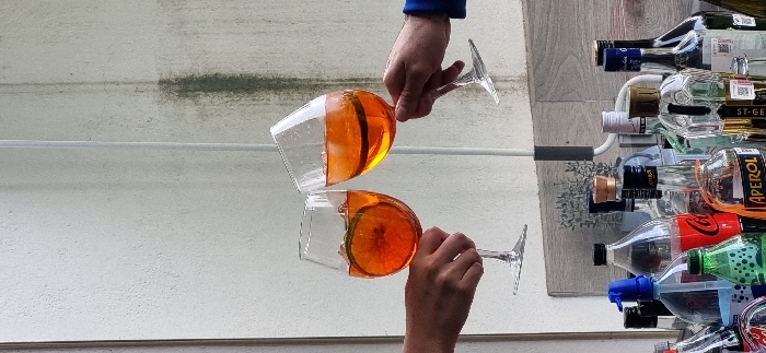 Two hands hold glasses filled with orange liquid and a slice of orange, as if making a toast. The glasses are mirrored, one above the other, reflecting the light. Behind them, a white wall with a horizontal pipe and a rack filled with bottles, including brands like Aperol, Coca-Cola, and St-Germain, is visible. The overall scene suggests a celebration or a social gathering.