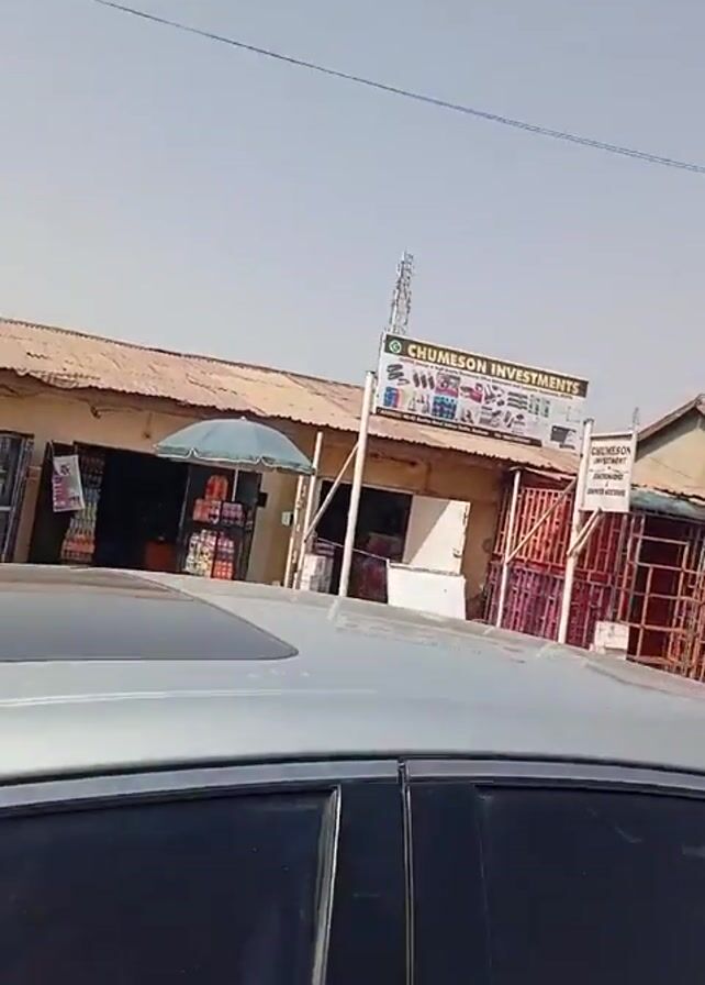 The video pans across a street scene, focusing on a row of small shops, one of which is identified by a sign that reads "CHUMESON INVESTMENTS." The camera moves across the roof of a silver car, then focuses on the roof of a dark red vehicle, showing a clear windshield and roof rack. The shops appear to be of a basic construction, with corrugated iron roofs. A cellular tower is visible in the background. The sky is light blue, suggesting a sunny day.