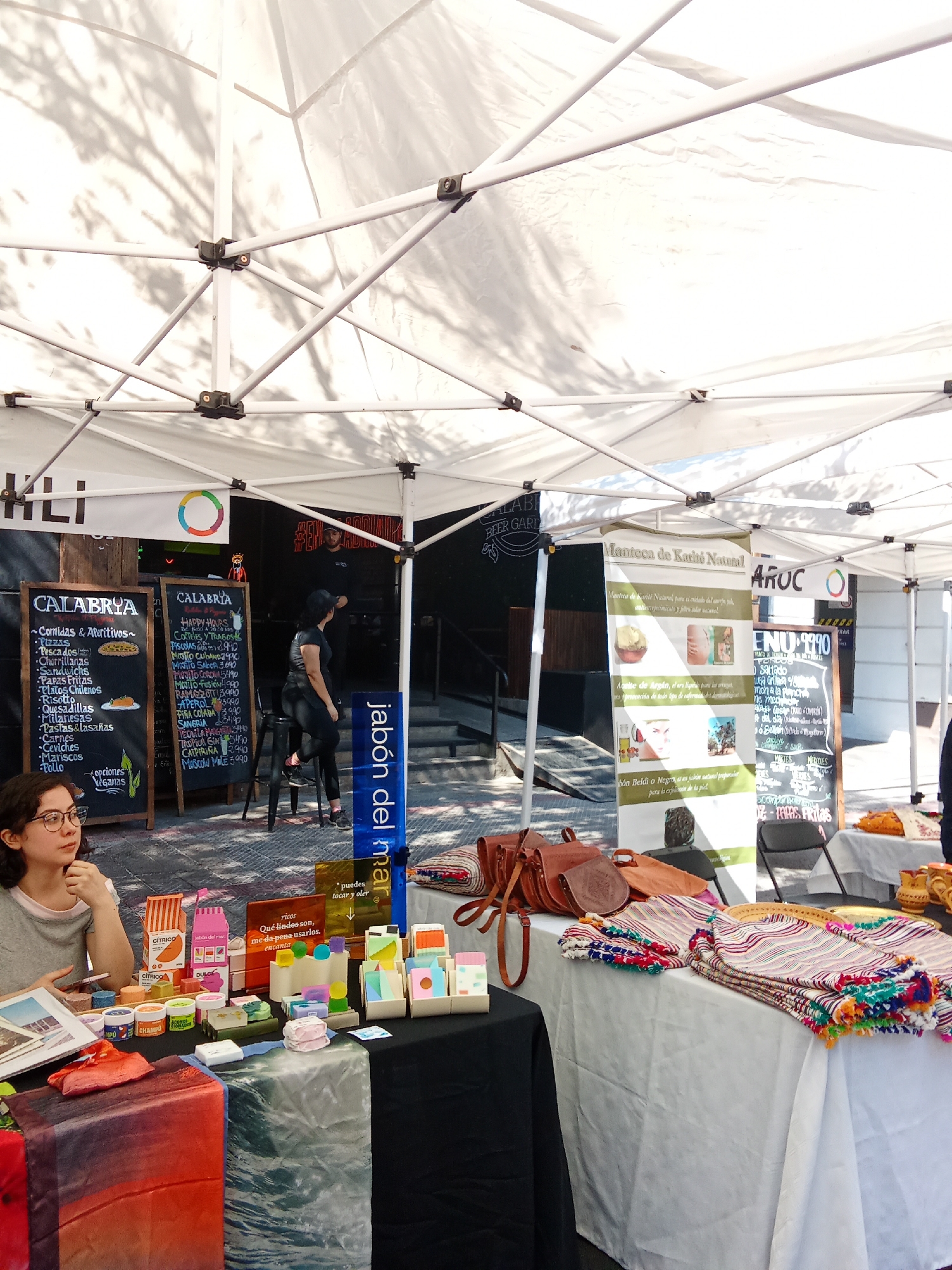 The scene depicts an outdoor marketplace in Providencia, Chile, presumably during the day. A woman wearing glasses sits at a table with a black tablecloth, displaying soaps and other personal care products. Behind her are two chalkboards advertising "Calabrya" with food and drink menus, implying a nearby restaurant or bar. Further back, another person sits at a stool near the entrance. To the right, another table is covered with colorful textiles and leather bags. A sign promotes "Manteca de Karité Natural" (Shea Butter). In the background, there is a black chalkboard advertising "ENU-9990", mentioning food specials. The entire setup is under a white canopy tent.