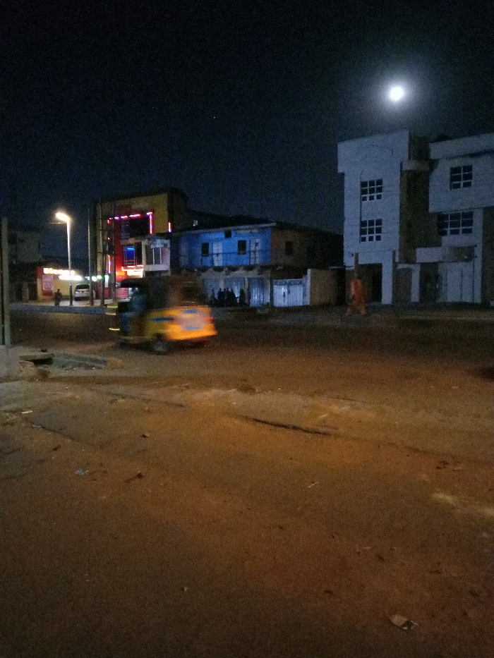At night, a street scene unfolds with a focus on the road leading towards several buildings. The moon shines brightly in the sky above the buildings. Buildings of varying colors, including yellow, blue, and white, stand near the road. A bright street light illuminates a building and a car, while a yellow vehicle drives past.