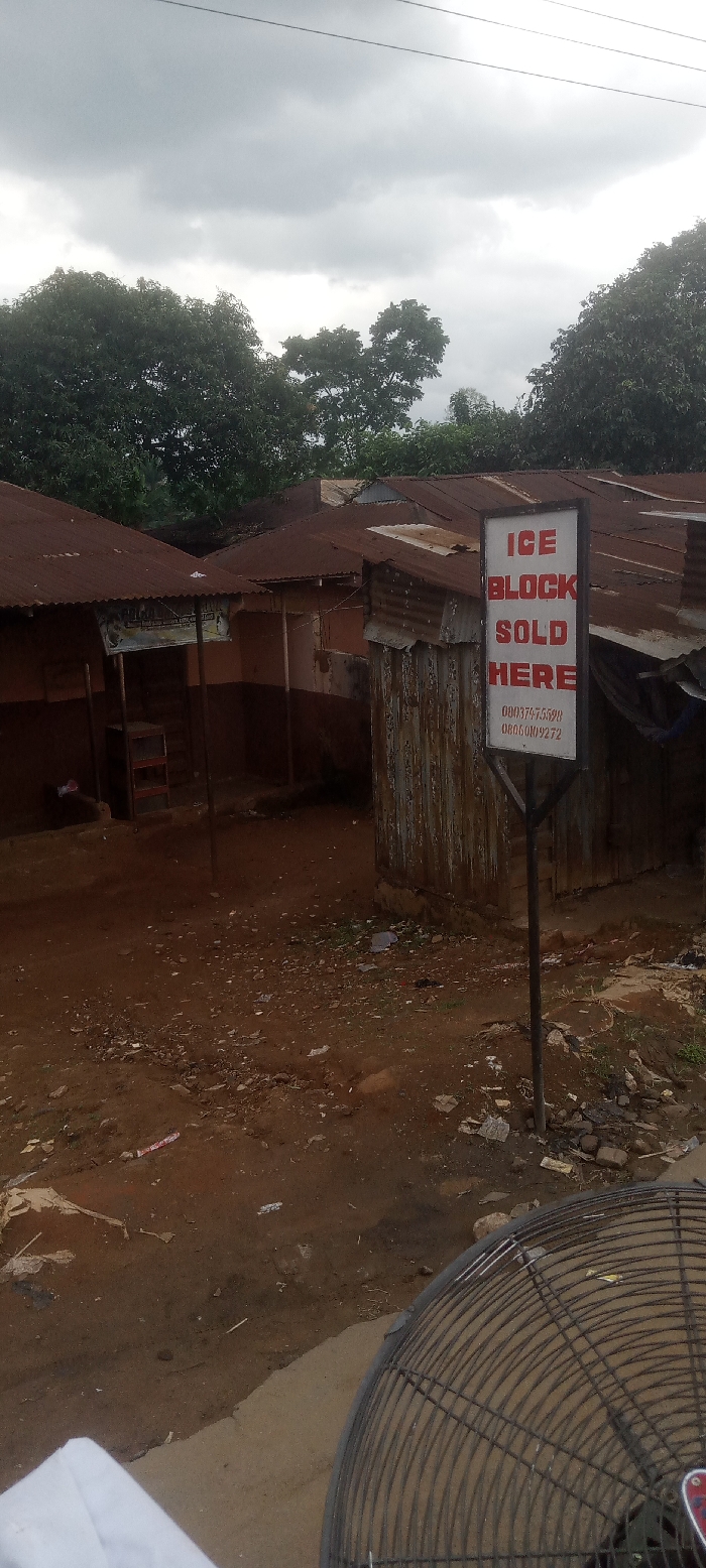 This image displays a semi-urban environment in Ezinifite, Nigeria, under an overcast sky. The foreground consists of reddish-brown dirt ground, uneven and littered with small debris and sparse vegetation. In the lower right corner, a portion of a black metal fan guard is visible, and in the lower left, a white object, possibly fabric. A prominent black-framed sign stands in the mid-ground on the right, featuring a white face with "ICE BLOCK SOLD HERE" printed in red capital letters. Below this text are two phone numbers: "08037475598" and "08060109272". This sign is positioned in front of a small, weathered structure constructed from heavily rusted corrugated metal sheets. Behind and to the left of the sign are multiple single-story buildings, primarily featuring aged and rusted corrugated metal roofs. The walls of these structures are painted in earthy tones, predominantly brown and reddish-orange. One building to the left exhibits an open front, revealing an interior and a multi-tiered, empty shelf unit. Another, less distinct sign is visible beneath an awning on this building. Dense green foliage from large trees forms the background, rising above the building roofs and extending towards a gray, cloudy sky. Overhead power lines are faintly visible across the top of the frame. No individuals are present in the scene.