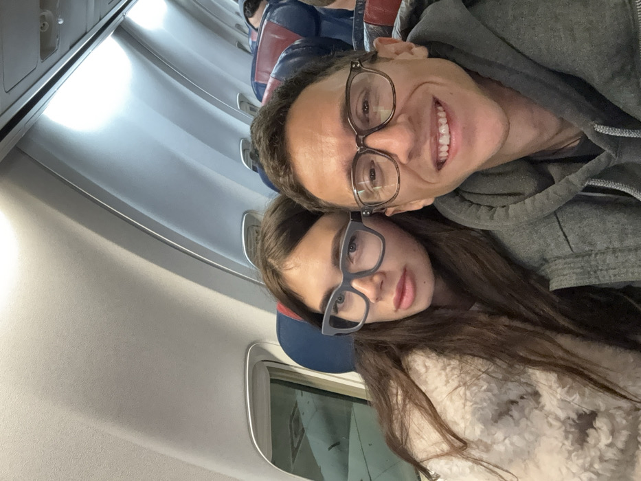 Inside an airplane cabin, a selfie captures a smiling man with glasses in a gray hoodie alongside a woman also wearing glasses
