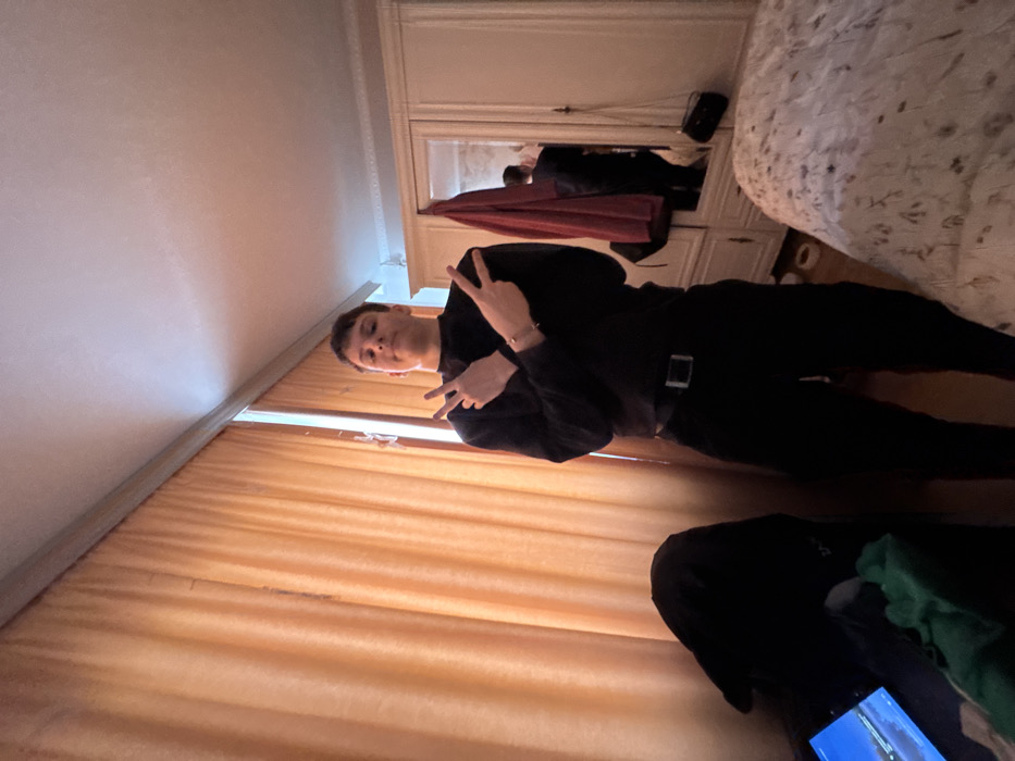 An indoor scene in Kozloduy, Bulgaria depicts a male subject standing centrally, facing the camera. The subject is a light-skinned male with short, dark hair, wearing a black long-sleeved shirt, black trousers, and a black belt with a rectangular silver buckle. A silver-colored bracelet is visible on his left wrist. His hands are crossed at chest height, both displaying a "peace sign" gesture with fingers extended. His facial expression is neutral. To the left of the subject, beige-orange vertical curtains cover a window, through which diffused light is visible. In the lower-left foreground, a dark object, possibly a bag or chair, supports a tablet or small laptop displaying a bright blue and white landscape image. A crumpled piece of green fabric rests near this object. To the right of the subject, a light-colored wooden wardrobe or cabinet with two doors is present. The right door features a full-length mirror, reflecting the subject's back. A dark red garment hangs from the handle of the right wardrobe door, and a black shoulder bag with a dark strap hangs on the mirror's right side. A section of a bed, covered with a textured, light-colored duvet or comforter, occupies the lower right foreground. A small, white, circular object rests on the floor between the bed and the wardrobe. The ceiling is white with decorative molding along the wall junction.