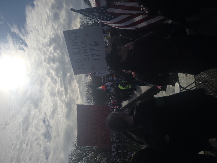 A daytime outdoor gathering shows protestors with signs and an American flag