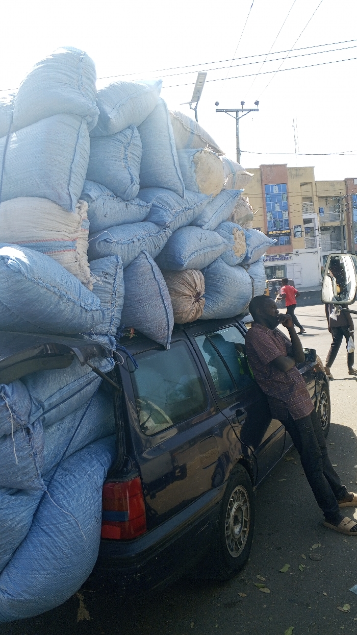 An overloaded dark blue station wagon is stationary on an asphalt street in Kawaji, Nigeria, under bright daylight. The vehicle is piled high with numerous light blue and several off-white woven sacks, which extend significantly beyond its roofline and rear, secured with ropes. A dark-skinned male in a plaid short-sleeved shirt, dark trousers, and light-colored slides leans against the vehicle's passenger side, his right hand near his chin. In the background, multiple-story buildings, some with commercial signage including "MAJESTIC SUPERMKT" and "TAPIA SALU SUPERMARKET," are visible. A utility pole with power lines and a solar-powered street light stands against the bright sky. Other individuals are seen walking in the mid-ground. The street surface exhibits minor debris.