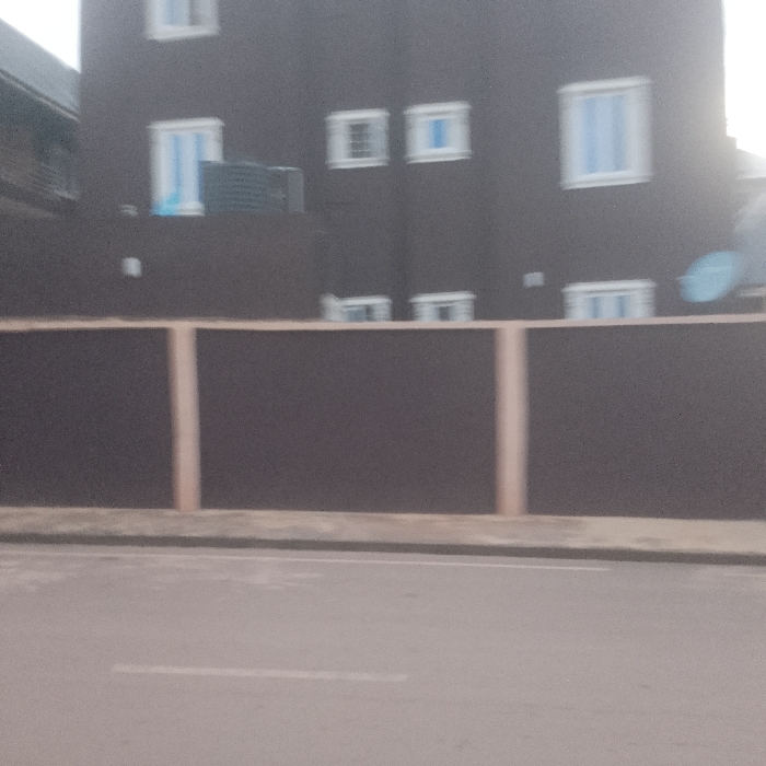 This image displays an urban or suburban street scene in the city of Unknown, Unknown. The foreground features a paved road with a faint white lane marking. A concrete curb separates the road from a dark gray perimeter wall, which is punctuated by lighter, vertical structural pillars. Behind this wall stands a multi-story building, also dark gray in color. This building exhibits several windows with white frames; some contain blue vertical coverings or blinds, while others display internal grilles. An outdoor air conditioning unit is mounted on a lower section of the building, above the wall. A light blue satellite dish is partially visible on the right side of the building. A portion of an adjacent structure with a dark roofline is present on the far left. No individuals or overt actions are depicted. The overall scene is static and appears to be under ambient daylight conditions, with the image exhibiting a slight blur.