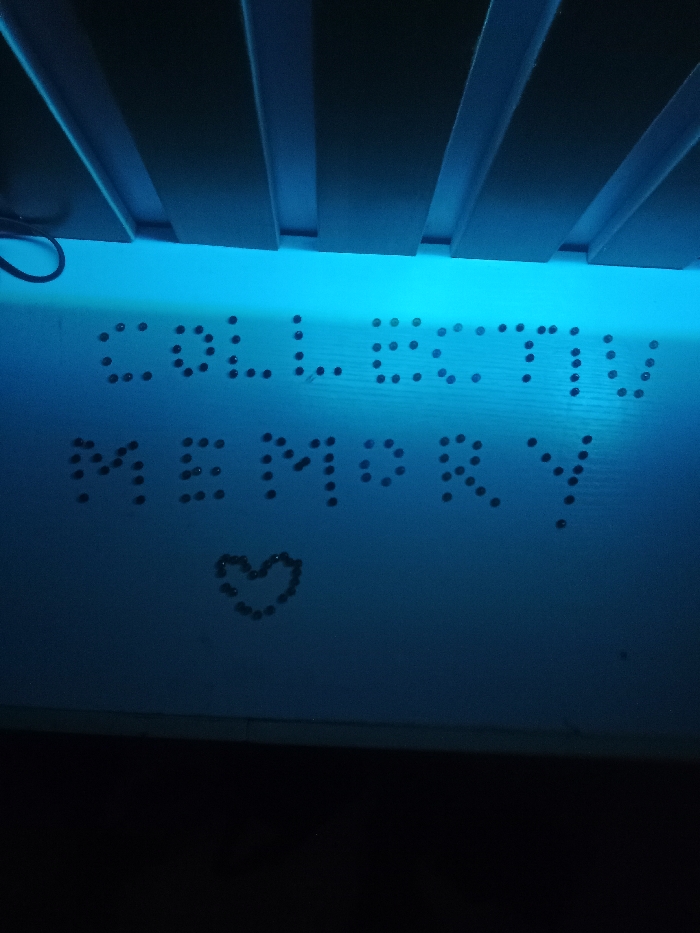 The image displays an undetermined indoor location, primarily illuminated by a strong blue light emanating from an unseen source below a series of parallel, dark, horizontal slats or louvers visible in the upper portion. On a light blue surface, likely a wall or board, small, dark, spherical objects are meticulously arranged. These objects form the uppercase text "COLLECTIVE MEMORY," presented in two lines with "COLLECTIVE" above "MEMORY." Below the text, the same type of dark, spherical objects are arranged to form a distinct heart shape. A black cable is partially visible in the upper left section of the frame. No individuals are present in the scene.