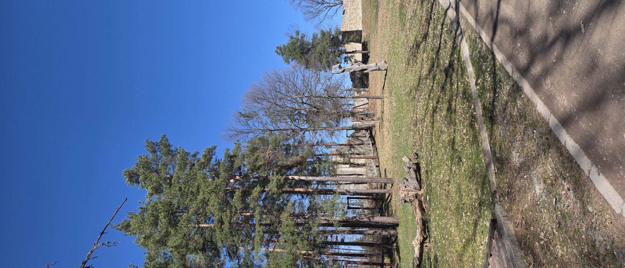 The image captures a scene in Belchin, Bulgaria. Tall, slender trees with green foliage line a grassy area. In the background, the remnants of a stone structure are visible. A path made of concrete runs along the right side of the image. A wooden sculpture stands on the grass. The sky above is a clear, bright blue.
