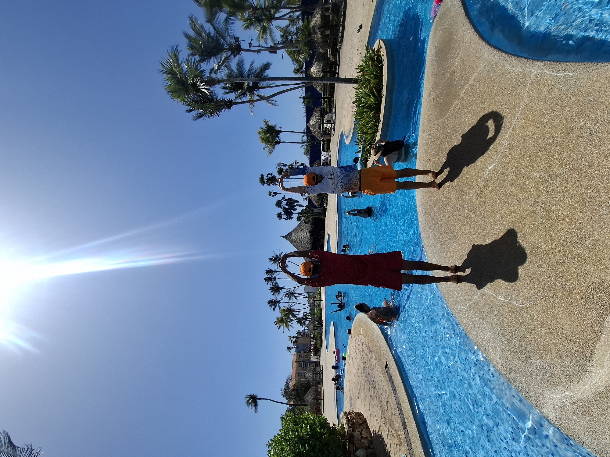 Two men wearing brightly colored clothing and hats stand at the edge of a swimming pool, arms raised in a gesture of stretching or celebration. One man wears red shorts and an orange hat, while the other wears orange shorts and a white t-shirt with an orange hat. The pool is filled with several other people. The pool is bordered by a tan, textured surface. Palm trees and thatched-roof structures are visible in the background. The sky is clear and blue, with a bright glare from the sun. The location is likely a resort or recreational area in Playa El Agua, Venezuela.