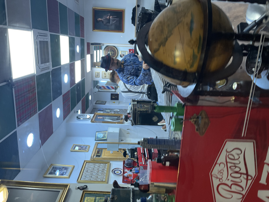 The image depicts the interior of a barbershop identified as "Los 3 Bigotes," located at Carrer de la Reina, 47, València, Spain. The scene is well-lit, featuring a ceiling with square panels in white and a multi-color tartan pattern (blue, green, red) interspersed with rectangular fluorescent lights and circular recessed spotlights. The walls are light-colored and adorned with numerous framed portraits and pictures. In the foreground, a red counter displays the barbershop's white "Los 3 Bigotes 47" logo. Various barber tools, bottles, and a red plastic container are visible on this counter. A large, vintage-style terrestrial globe on a dark stand occupies the right foreground, partially obscuring the individual behind it. Two individuals are prominently visible in the mid-ground. On the right, a man with a mustache, wearing a dark fedora, a blue patterned long-sleeved shirt, and a light brown bow tie, is seen from the chest up, facing left, seemingly holding a grooming tool. To his left, another man is reclined in a black and white striped barber chair, with his torso visible, wearing a light shirt and dark suspenders. His head is not within the frame. In the mid-ground left, a red multi-drawer tool chest holds various barber supplies. A classic red, white, and blue barber pole is visible further back on the right wall. Additional framed artwork, a circular wall clock, and dark wooden or metal cabinets are visible throughout the background. A third male individual's head is partially visible in the distant background.