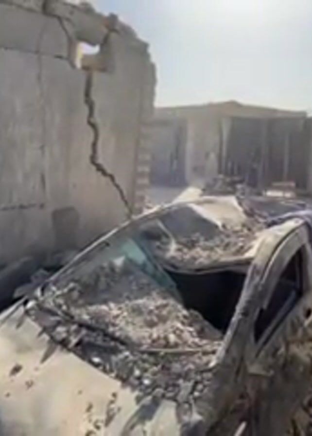 The scene depicts a destroyed environment, possibly following an explosion or earthquake. A heavily damaged car is buried under rubble, with debris covering its hood and windshield. Adjacent to the vehicle, a building shows significant structural damage, including a large crack in its wall and missing sections. In the background, a group of people are gathered, seemingly observing the devastation. The setting appears to be a rural or semi-arid area, under a clear sky.