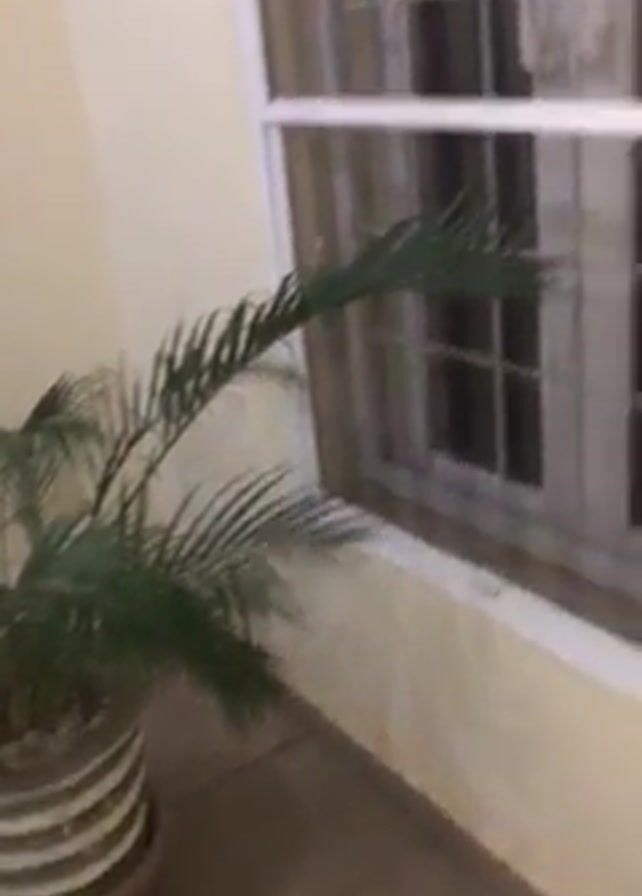 slow pan through a room, starting with a potted palm tree near a window with a security grate