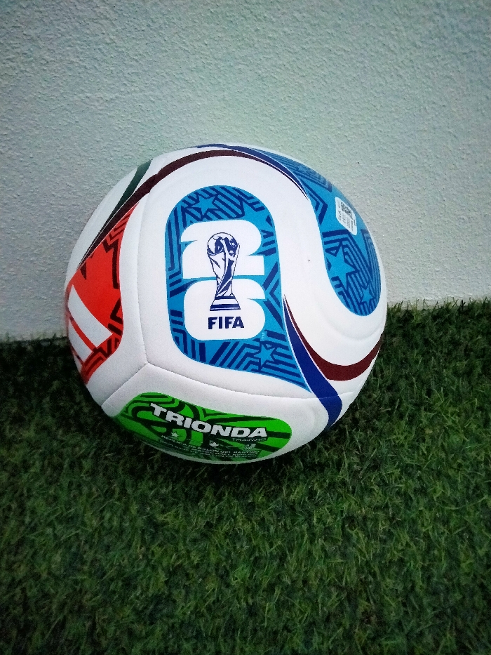 A soccer ball rests on artificial green grass. The ball is predominantly white with accents of blue, red, and green. Prominent features include the blue "26" with a FIFA trophy silhouette, and "TRIONDA" in green lettering. The background shows a simple, light grey wall. The design on the ball and the setting suggests it is related to a FIFA World Cup event.
