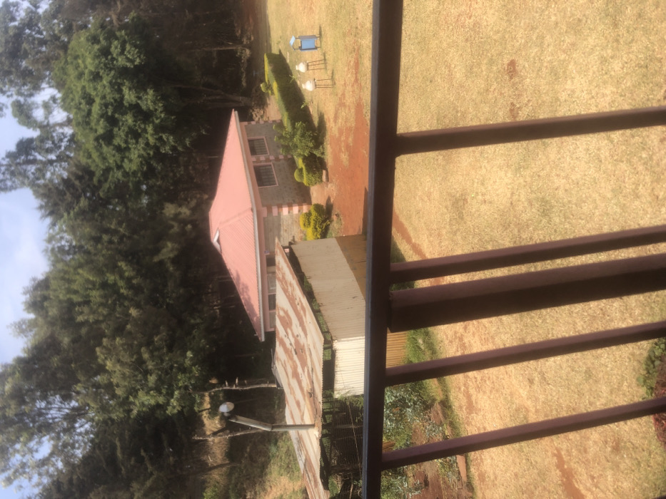 This image depicts an outdoor scene in Ngong ward, Kenya, viewed from an elevated perspective partially obscured by a dark-colored metal railing in the immediate foreground