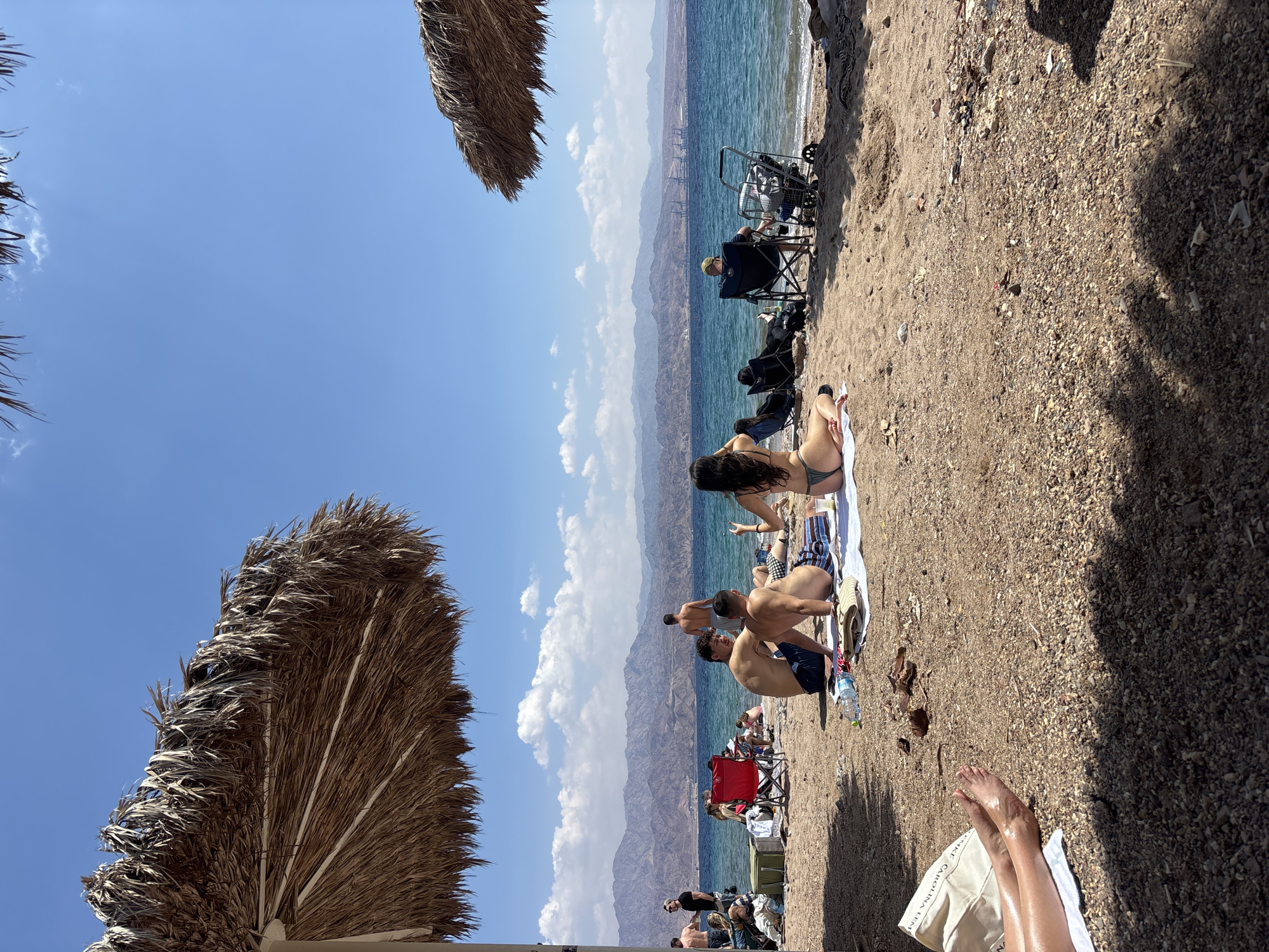 The image presents a sunlit beach scene on the northern shore of the Gulf of Aqaba, in Eilat, Israel