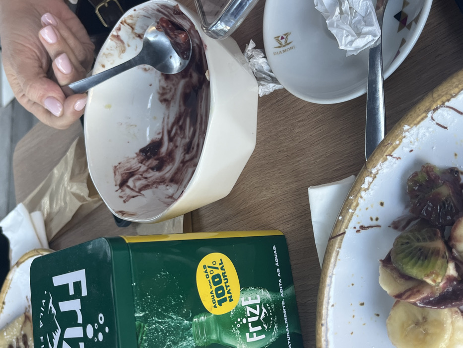 The image displays an overhead close-up of a wooden table at Diamori Gelataria e Creperia, located on R. Dr. Artur Sá, 4750-280 Barcelos, Portugal. In the upper left, a green rectangular container for Frize sparkling water, labeled "ÁGUA COM GÁS 100% NATURAL VILA FLOR," stands upright. To its right, a large white polygonal bowl is partially filled with dark reddish-brown residue, likely from a berry or chocolate-based dessert. A silver spoon rests inside this bowl, held by a human left hand featuring light pink manicured fingernails. Behind this bowl, a crumpled brown paper bag lies on the wooden surface. In the bottom right quadrant, a smaller white ceramic bowl, branded with "DIAMORI" and a diamond logo, contains a crumpled white paper napkin. A silver utensil is partially visible beneath this bowl. In the bottom left, a section of a white ceramic plate is visible, holding slices of banana and kiwi, coated in a dark reddish-brown sauce, with some white powder residue on its rim. The scene depicts the remnants of a meal or snack.