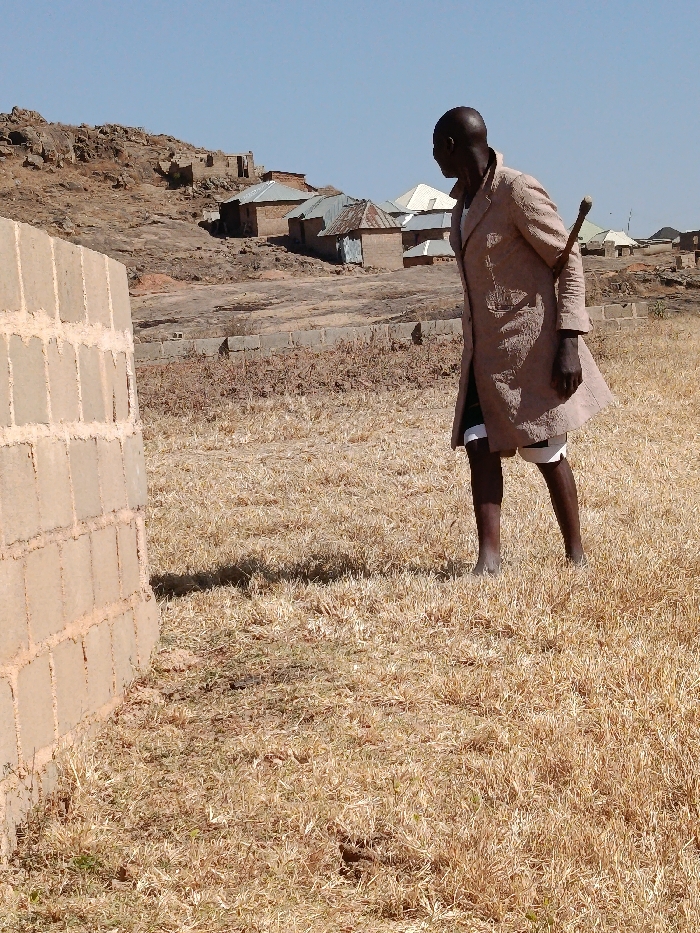 An outdoor, daytime scene in the city of Dong, Nigeria, depicts an adult male walking from right to left across a field of dry, tan grass. The individual has dark skin and a bald head, dressed in a light brown, knee-length coat with white undergarments visible on his thighs. His lower legs and feet are bare. A dark staff is carried on his right shoulder. To the immediate left, a partially constructed wall made of light brown concrete blocks stands. In the background, several simple buildings constructed of brick or mud with corrugated metal roofs are scattered across a rocky, elevated landscape, leading to rugged hills under a clear blue sky.