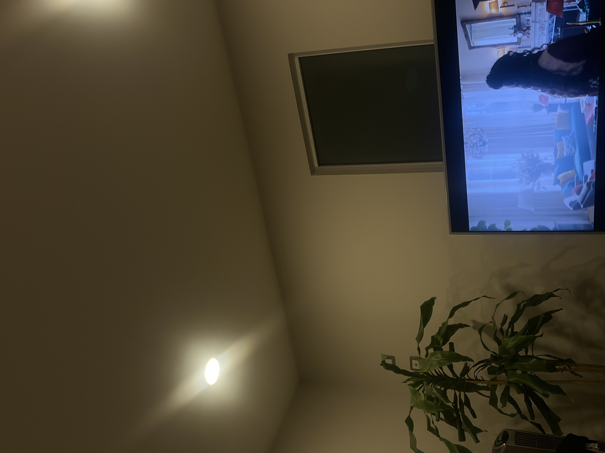 Located in Barrio de Nuevo León, Mexico, the scene depicts an interior room with light-colored walls and ceiling, illuminated primarily by a single bright, circular recessed light fixture positioned in the upper left. A tall, green-leafed potted plant stands in the lower left quadrant, casting a subtle shadow on the wall behind it, and featuring a small, light-colored square attachment on one of its upper stems. Partially visible to the immediate left of the plant is the top portion of a dark, vertical tower fan or air purifier. A rectangular opening or framed panel with a dark, opaque surface is visible on the upper right wall. In the lower right, a large flat-screen television is active, displaying an indoor scene with a distinct blue tint. The content on the screen features the back of a female figure with long, dark, curly hair, facing a room furnished with a blue sofa, yellow cushions, lamps, a chandelier, and a large wall mirror above a mantelpiece. No individuals are present within the depicted physical room.