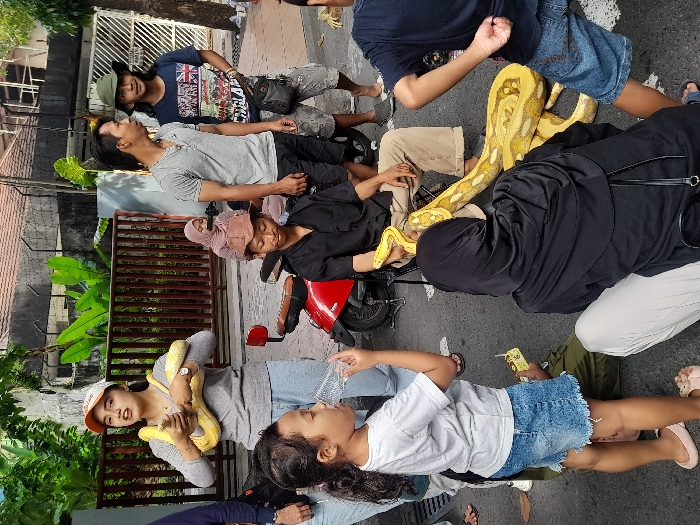 - "A group of people is laying down on an outdoor pavement while holding large yellow snakes" by FM-8CAHW2, licensed under CC BY 4.0